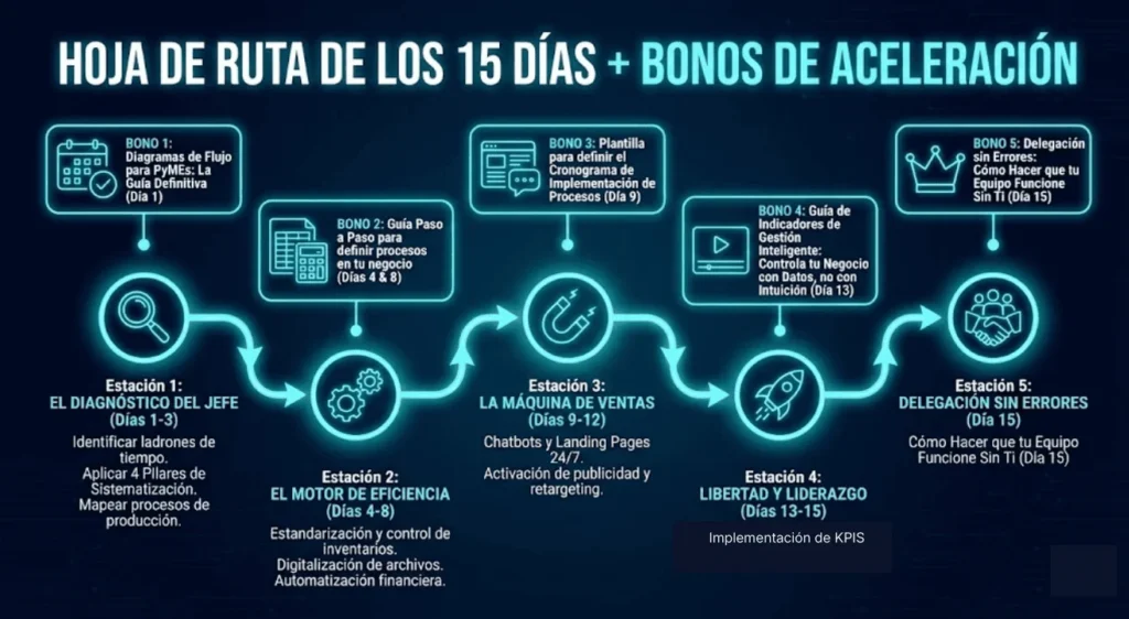 Con esta hoja de ruta de 15 días, ejecutarás lo correcto en el orden exacto para que tu PyME trabaje para ti sin contratar personal ni comprar software.
