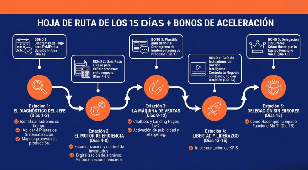Con esta hoja de ruta de 15 días, ejecutarás lo correcto en el orden exacto para que implementes en tu PyME una arquitectura de procesos que sustituya tu vigilancia física por resultados medibles